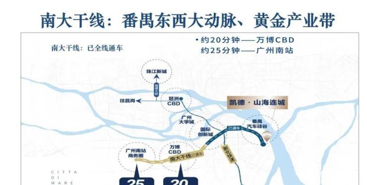 好处是项目自驾还算方便,目前南大干线已经全线开通,去往南站、万博、大学城、创新湾等地都很快,比如去往琶洲,仅仅26分钟的车程时间