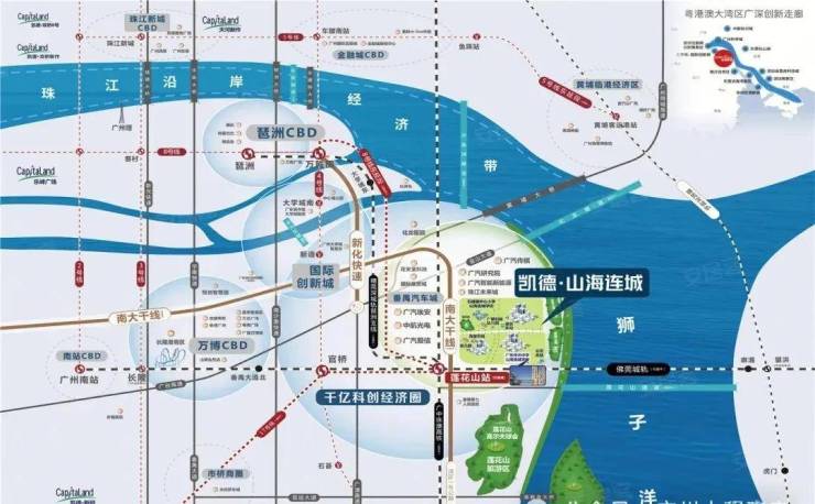莲花湾板块,属于番禺东石楼镇,整体发展缓慢,配套不齐全,得益于南大干线的开通,缩短了到市区的距离,开车出行非常方便,比如到琶洲30分钟左右,还有规划地铁8号线东延段,但是也要3-4公里,跟17号线,还有两条城轨,一条高铁,打造所谓的五轨交汇的莲花湾TOD,不过都是需要时间兑现,哪怕建好都是不近现在在售的楼盘,也要2-3公里。