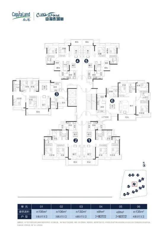 项目一共有5个面积段,分别是85平三房两厅一卫,91/106平三房两厅两卫,130平A户型五房两厅两卫,130平B和135平户型四房两厅两卫。