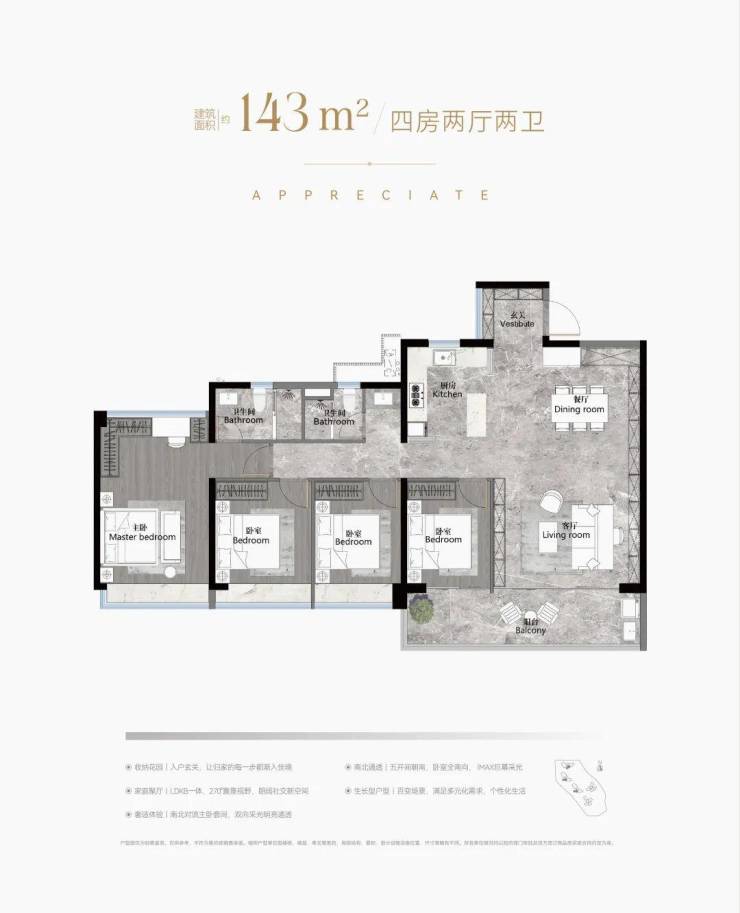 建面168平四房三卫,放大版的142平,做了双主套,适合三代同堂家庭,单边位,南北对流采光通风都非常好,约40平的大房厅,景观阳台开间约8.2米.