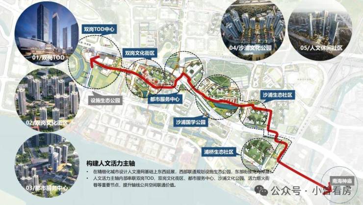 西至设施生态公园,东联南海神庙,构建串联TOD商业、文化街区、都市服务、生态社区等重点项目的漫游活力轴,重点塑造“双岗TOD中心、都市服务中心”两大综合商业地标及“双岗、沙涌”两大休闲文化街区,目前双岗TOD中心已确认引入华润万象系商业运营