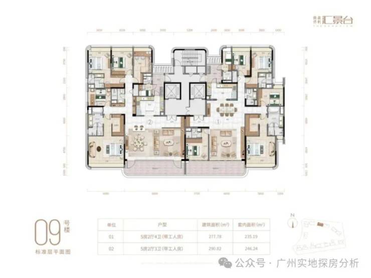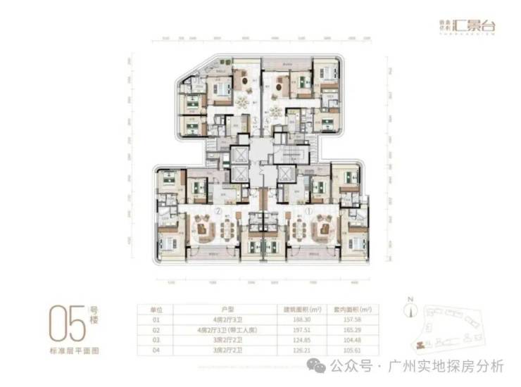 项目由14栋12层小高层组成,涵盖123-352㎡三至五房,共8类户型。