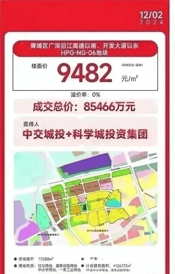 2024年12月02日,黄埔区广深沿江高速以南、开发大道以东HPG-NG-06地块被中交城投联合广州峻森投资有限公司以底价85466万元拿下,折合楼面价9482元/㎡。