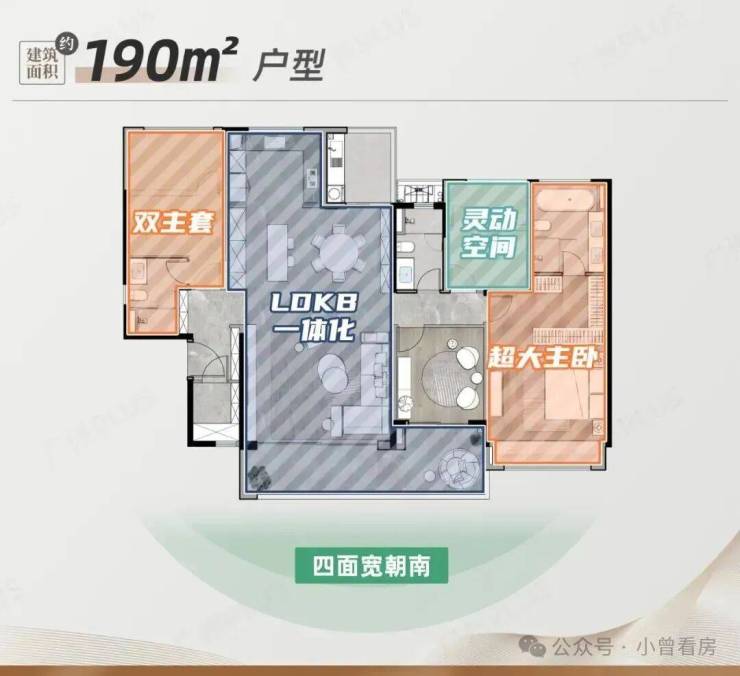 190㎡户型南北对流双阳台,南看2万方花园绿洲,北望珠江新城CBD,这就是触手可及的豪宅“天花板”该户型设有入户玄关和储物间,通过将客厅、餐厅、厨房和阳台一体化设计,LDKG布局创造了一个开放、共享的生活空间,使家庭成员可以更容易地聚集在一起,享受家庭时光。