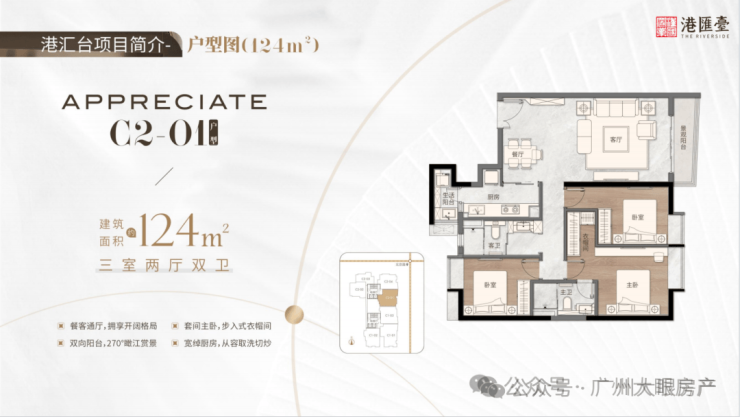 124㎡三房两厅两卫,餐客通厅,拥享开阔格局,套间主卧,步入式衣帽间,双向阳台,270度瞰江赏景,宽绰厨房,从容取洗切炒
