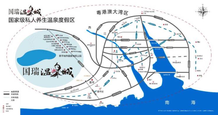 国瑞·温泉城,山湖温泉度假城,位于恩平国家级地质公园景区内,毗邻三山河水资源保护区。拥有丰富的珍稀地热温泉资源,含30多种对人体有益的微量元素和矿物质,依山傍水,超高的绿化率使项目与自然紧密依偎;项目地块内拥有稀缺的黄金储备,黄金含量达到1g/m³土,可谓风水宝地。