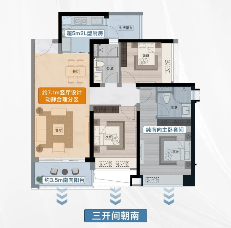 奢阔餐客双厅 · 纯南阳台 · L 型厨房 · 豪华主卧套间
