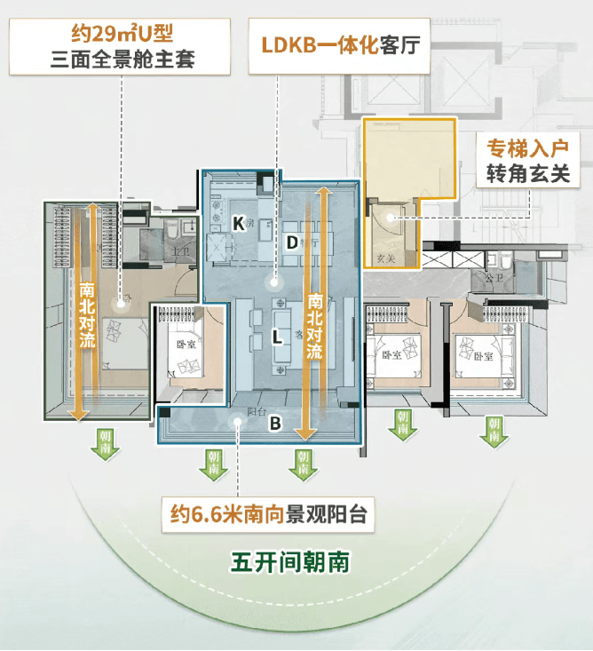 约14.7米南向面宽,餐客厅+主卧均南北通透,清风时时流连
