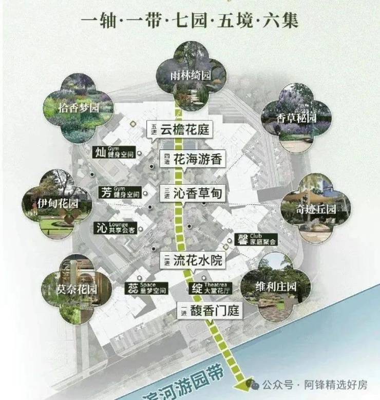 项目园林将打造六大社区花园,外部将优化南侧水道,打造一线河景+双公园
