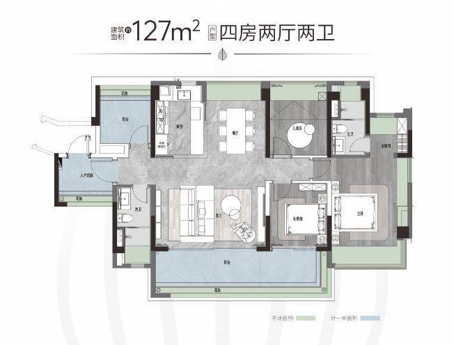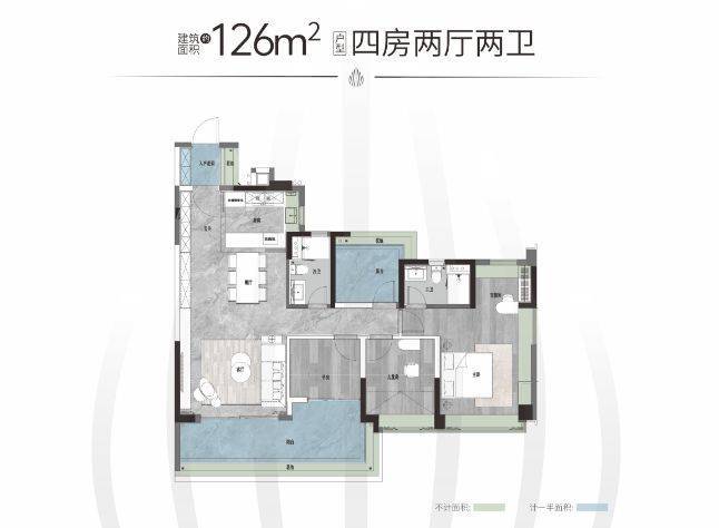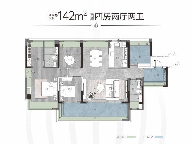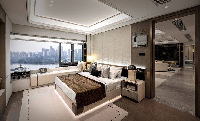 建面约125-142㎡一线江景四房:5.7米宽厅、南北对流、酒店式主卧三面采光,实用率远超市场平均水平;