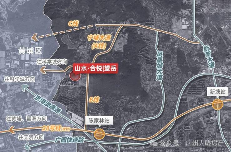 如果选择地铁出行,有规划中的28号线的陈家林路站,距离项目大概只有900米左右,目前规划站点在合生湖山国际那边,但还是存在一定的不确定性,地铁建好开通以后,坐地铁去天河、海珠、黄埔等区也非常方便。
