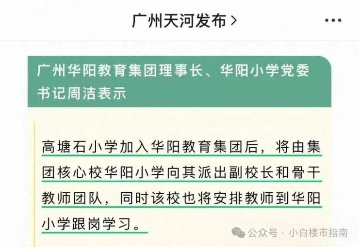 项目楼下就是广州市幼师附属幼儿园,对面就是高塘石小学{去年已经官宣纳入天河第一梯队的华阳教育集团},而且办学规模还会扩建到24个班,据“天河发布”公众号公布的消息,高塘石小学纳入华阳教育集团后,会由原来的华阳小学向其派出副校长和骨干教师团队进驻。