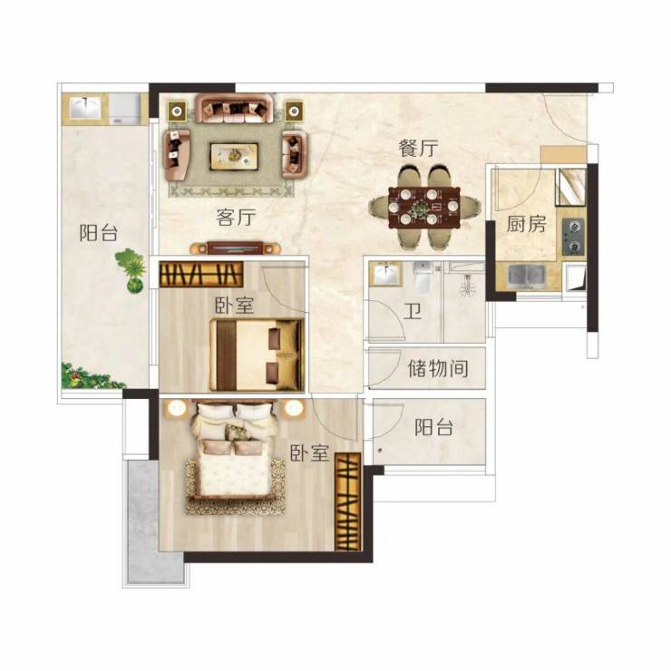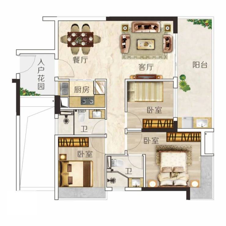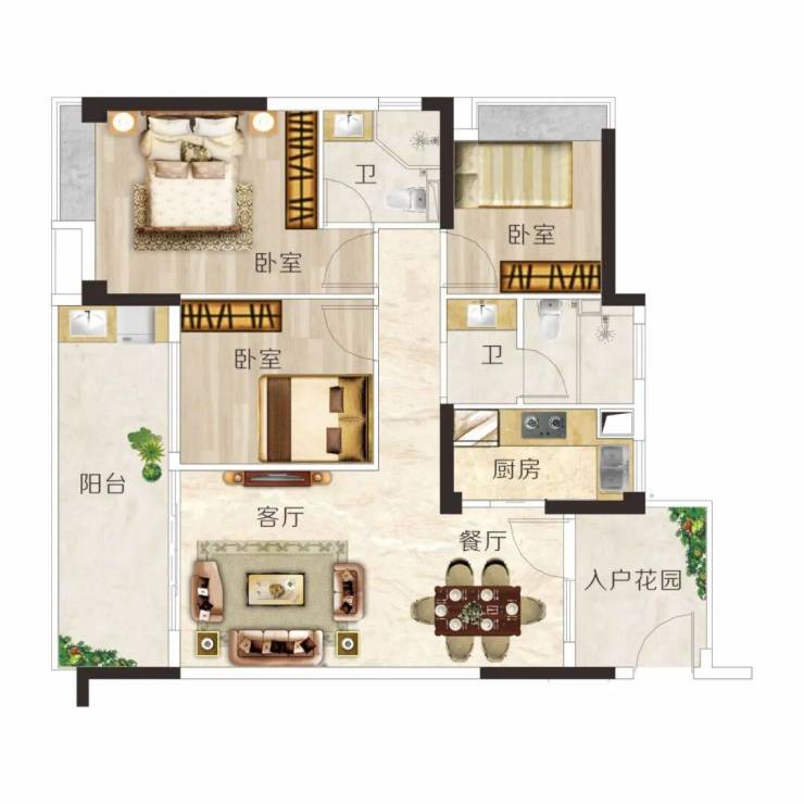 E户型 建面约106m² 3房2厅2卫◆户型方正实用,动静分区,布局科学◆阔绰双厅,宴请亲朋,尽显大家风范◆超大宽面阳台,一家人的空中大花园◆主卧带转角飘窗,视野开阔无遮挡