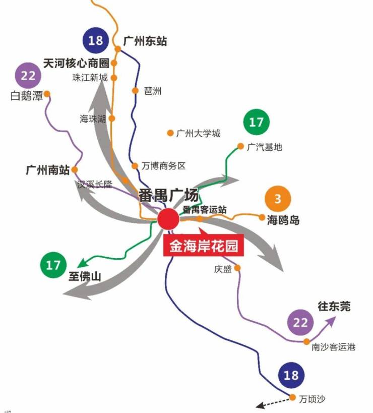 交通便捷是金海岸花园的一大优势,项目周边有5条地铁线路交汇,包括3号线、3号线东延线、18号线、22号线和规划中的17号线,连接广州市内及周边城市。此外,项目周边商圈繁华,与多个核心商圈、学府、以及湿地公园相邻,既享受繁华生活,又能感受静谧。