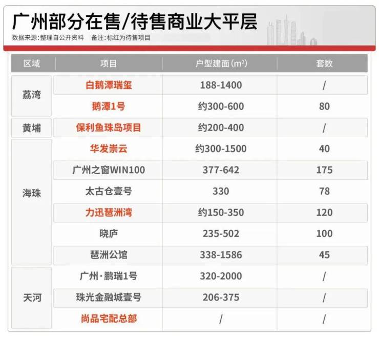 豪宅项目云集,商业大平层(指商业性质的大面积平层公寓/办公产品)也呈现出激烈竞争的局面。据不完全统计,仅在核心区(天河、海珠、荔湾、黄埔),就有超过12个在售和待售项目。
