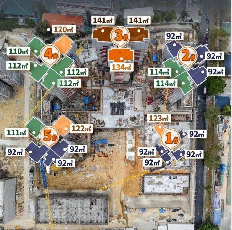 项目主推92-141㎡三至五房,全南向设计,主打高使用率,最高可以达到118%,关键词:110%+使用率、2梯3-5户、全南向。