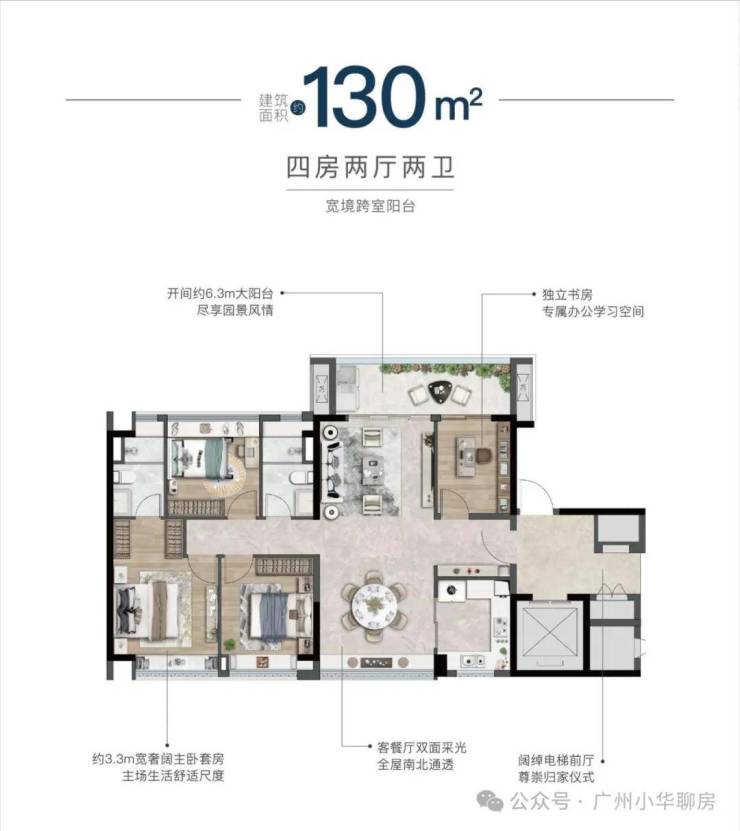 建面约104-168㎡纯改善四房,朝南而居,南北通透,阳光清风常伴,满足品质改善需求。