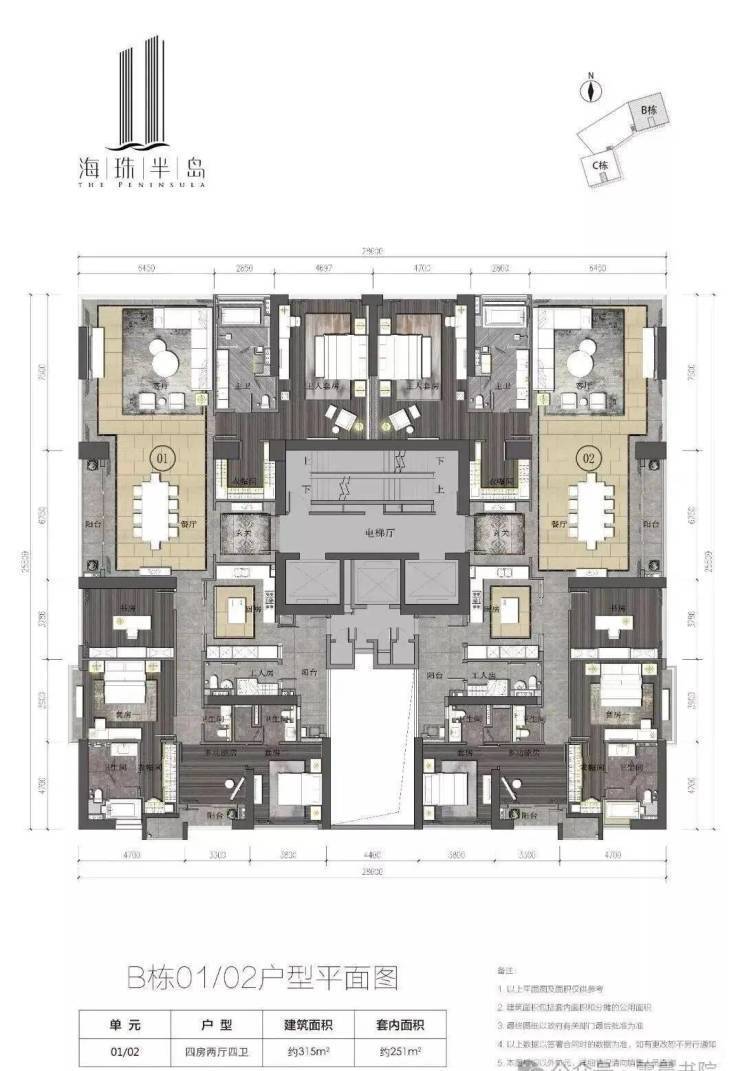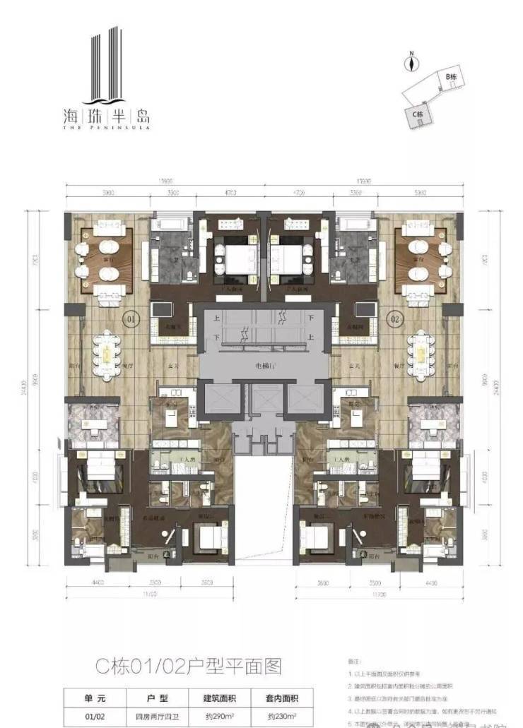 仅有 B、C 两栋 43 层超高层。户型为建面约 290㎡和 315㎡的大平层江景四房,均采用三梯两户的四套房设计,保证了居住的私密性与舒适度,高实用率让空间得到充分利用,满足豪宅居住需求。