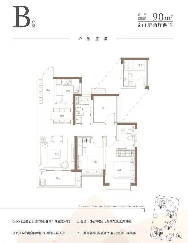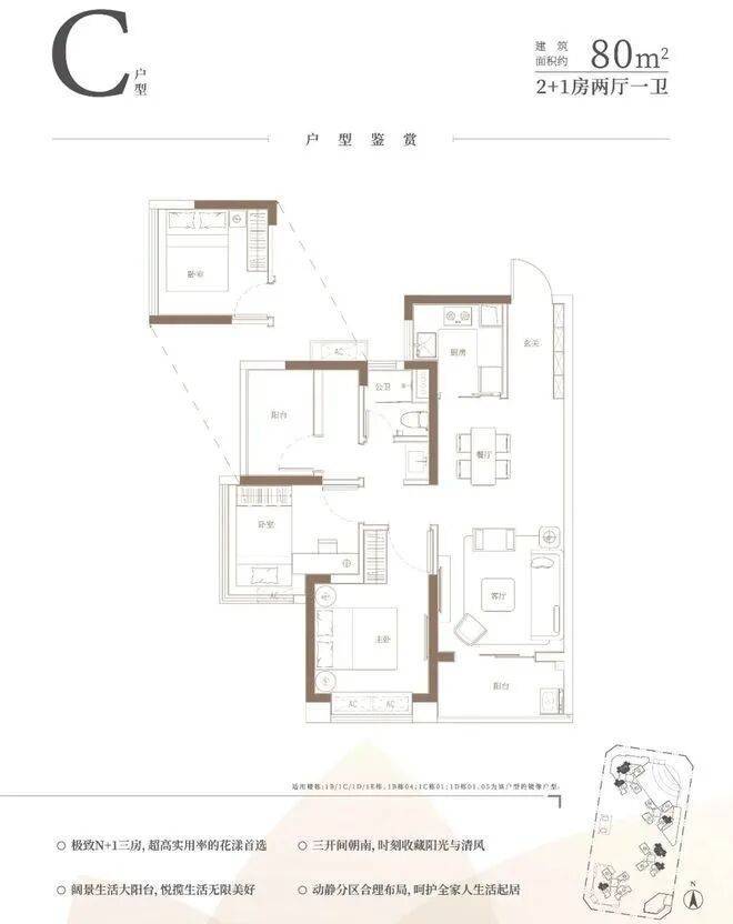 中旅·名门府推出的户型设计涵盖了约80-116平方米的N+1三至四房以及低密叠墅160㎡,每个户型均精心设计,充分考虑到了空间利用和居住舒适度。特别是主打的A户型(建面约101㎡,3+1房两厅两卫),B户型(建面约90㎡,2+1房两厅两卫)和C户型(建面约80㎡,2+1房两厅一卫),通过合理的空间布局和灵活的设计,满足了现代家庭对居住空间的不同需求。这些户型不仅注重实用性,更体现了新一代空间美学的理念。约80㎡2+1房1卫(北/西南朝向)