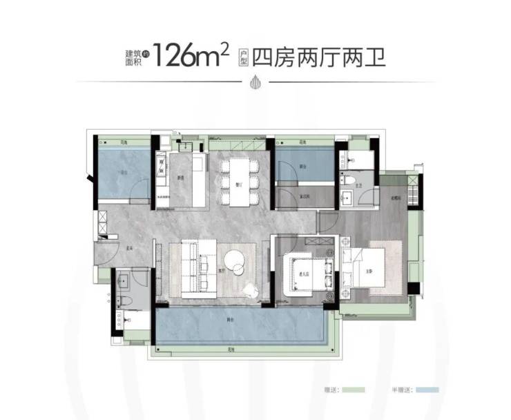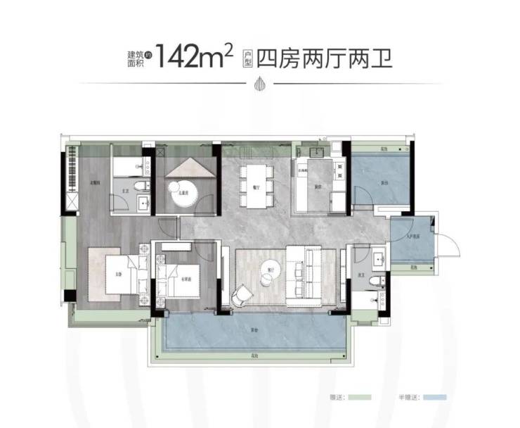 以约142㎡四房为例,南向江景阳台面宽接近9米、进深2.2米。面积足足有约20㎡,相当于别人家的主卧,分外气派。