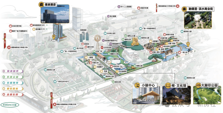 小区配套:包括约9万㎡写字楼、约5万㎡酒店、约5000㎡风情商业街以及约13万㎡的大型购物中心。此外,项目还规划了11所学校,包含6所幼儿园、2所小学、1所九年一贯制学校、1所高中。