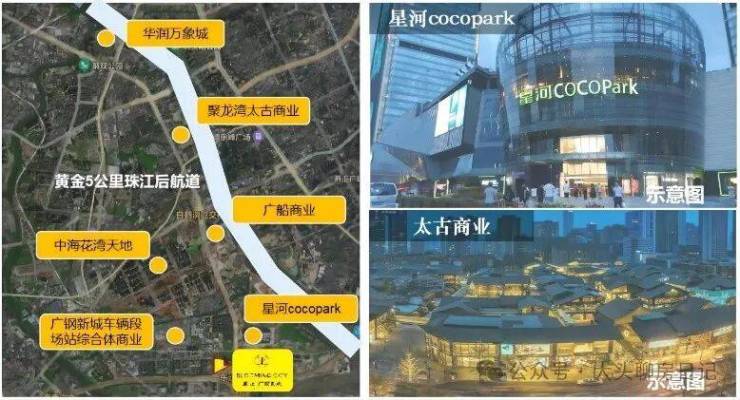 汇聚5大商圈,星河COCOPARK(2023年国庆已开业)、广船大型滨水商业区(建设中)、白鹅潭华润万象城(建设中)、聚龙湾太古商业(建设中)、中海花湾天地,举步即享繁华生活。