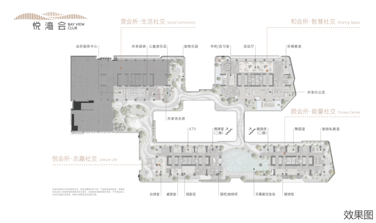 【约5000㎡新精致主义社交CLUB——“悦湾会”打造精奢生活社交场】柏悦湾首创约5000㎡新精致主义社交CLUB--"悦湾会",以多维空间折叠生活的理念建构和、颜、悦、赏四大主题会所。• 和会所:个人阅读、沙龙分享、共享办公等 • 颜会所:壁球健身、瑜伽舞蹈、天幕泳池等• 悦会所:时尚酒吧、国际桌游、动感观影等 • 赏会所:共享厨房、共享洗衣房、萌宠中心等