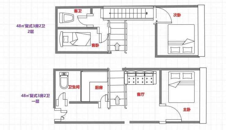 48㎡㎡3房2卫