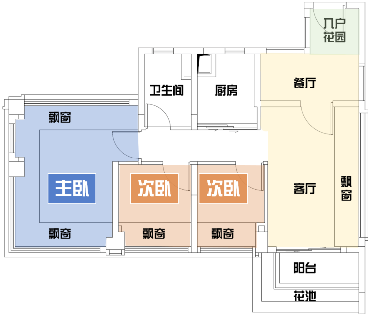②进阶格局:4.5开间朝南、南北对流、主卧270°环幕飘窗