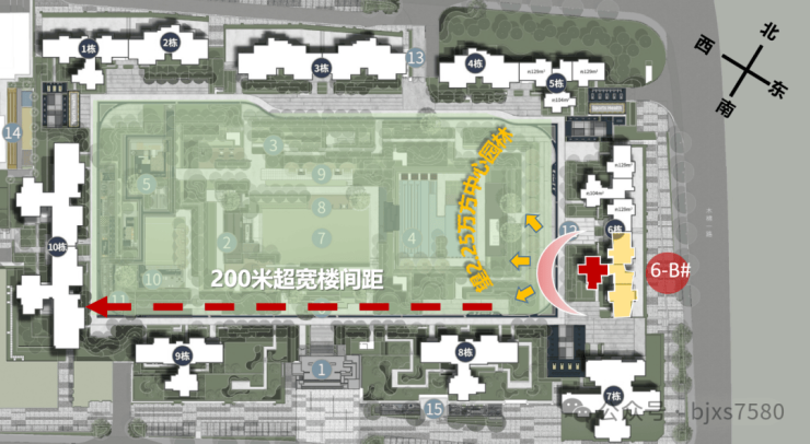栋间距最大约200米,约等于2.8个国际标准足球场大小;
