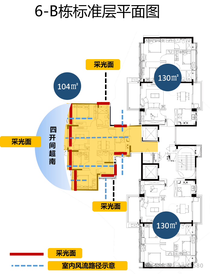 建面约104-168㎡纯改善四房,朝南而居,南北通透,阳光清风常伴,满足品质改善需求。