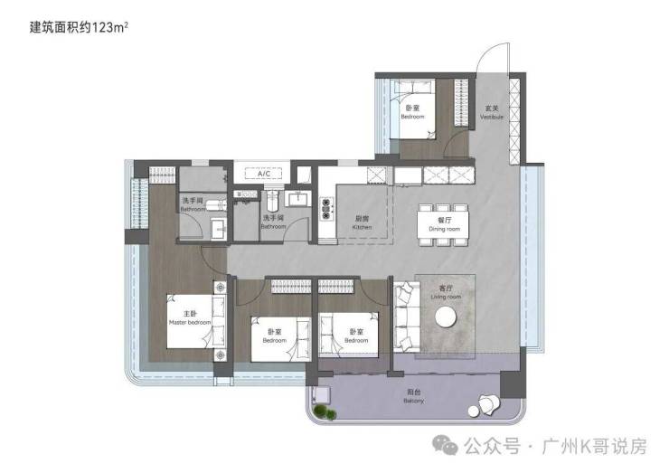 123㎡创意四房两卫,约15.9m奢阔采光面,南北通透大开间,时刻享受阳光与鲜氧