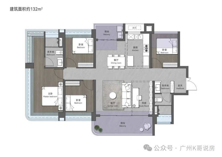 132㎡创意四房两卫,西南向,超50㎡大方厅,格局大气阔绰通透