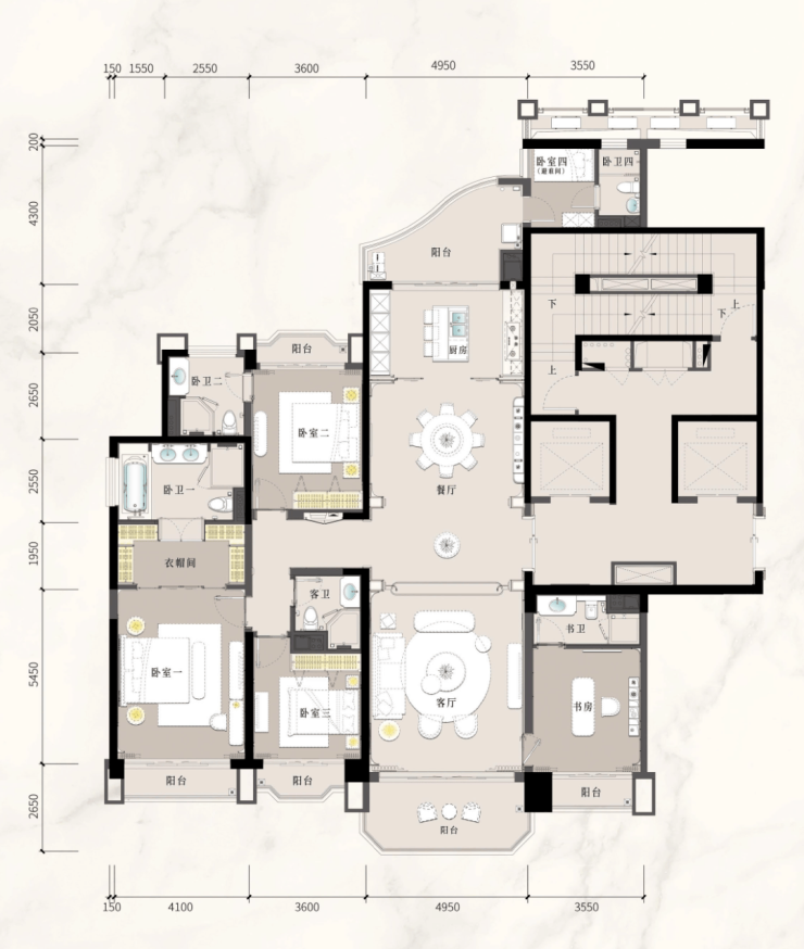 286㎡4房、394㎡4+1房、682㎡5+1房大平层