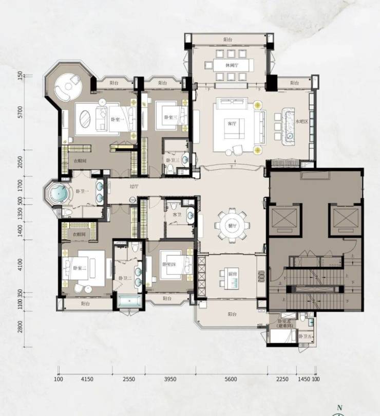 以约 236㎡的 A3 星盈淡雅户型为例,五房三厅五卫的设计,空间布局合理,功能齐全。南北通透的设计,让室内空气流通顺畅,同时奢享江城园景。