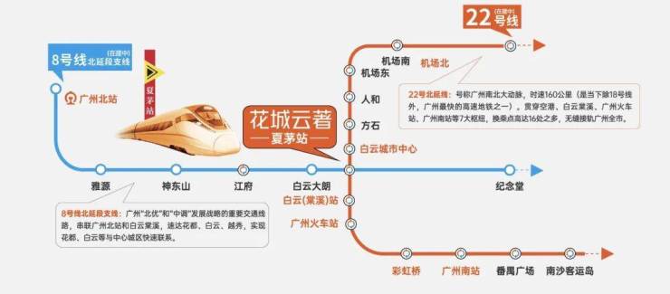 🚇距地铁22号线、8号线北延段支线双线交汇的夏茅站仅约20米。乘22号线,1站白云新城站,2站越秀,3站荔湾,换乘18号线,5站直达珠江新城(冼村)。乘8号线北延段支线,迅达越秀、花都,串联广州北站和白云棠溪TOD。
