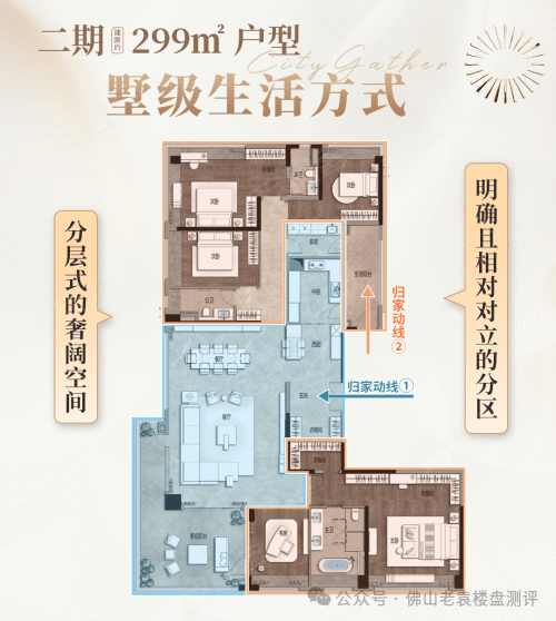 顶豪藏品:建面约 299㎡ 五房两厅三卫,独梯入户私享独立电梯厅,70㎡客餐厅一体化奢阔空间,8.2 米 L 型环幕观景阳台,中西厨分离设计,双南向主卧套房带景观浴缸,顶豪配置拉满。