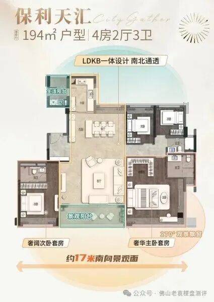 高端改善主力:建面约 194-199㎡ 四房两厅三卫,全南向双套房设计,9.7 米 IMAX 横厅,270° 全景飘窗,空间尺度对标 200㎡+ 大平层,适配终极改善家庭。