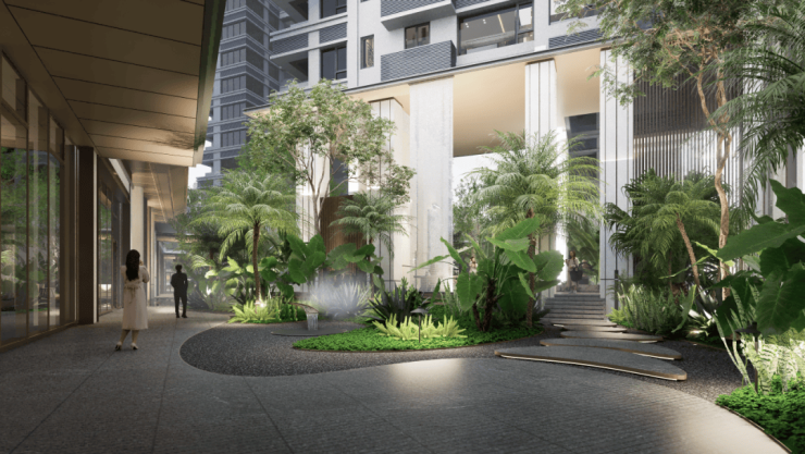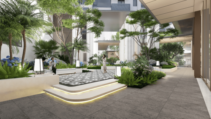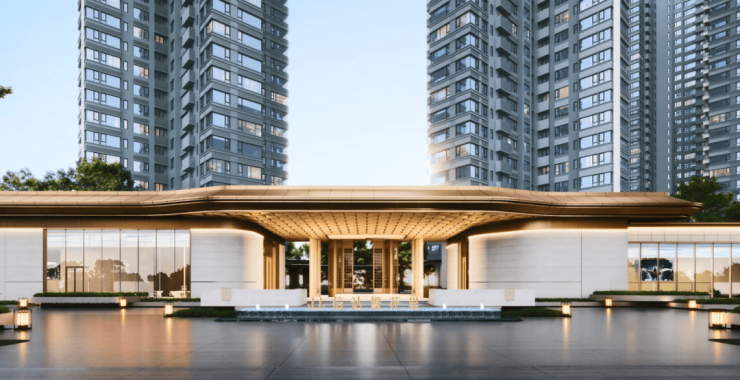 「繁花归宇」景观大堂豁然铺展,“前庭后院“的设计手法,使中心水庭藏而不露;金属屏风汲取了余荫山房玉兰花的设计灵感,通透立面辉映天光云影,精筑门庭以艺术线条勾勒仪式感。花影摇曳,浅水低吟,归家步履被温柔包裹,瞬间卸下尘嚣,心境澄明如洗。