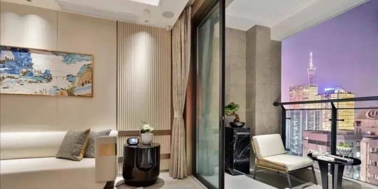 约30平的大客厅,连通达约11平的阳台,将室外的繁华CBD景观延展到室内。