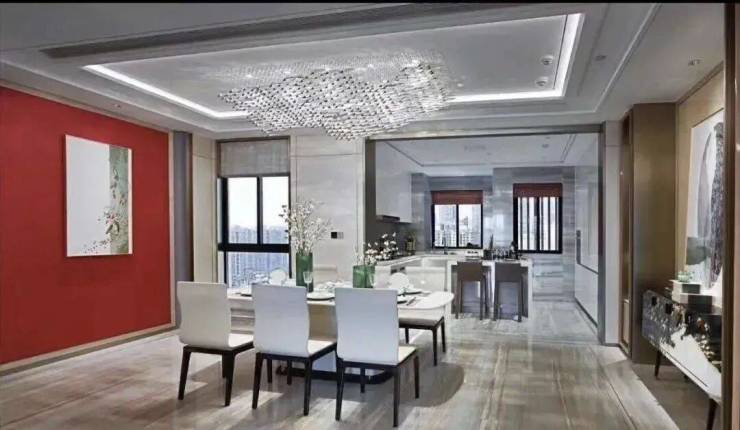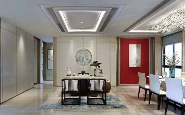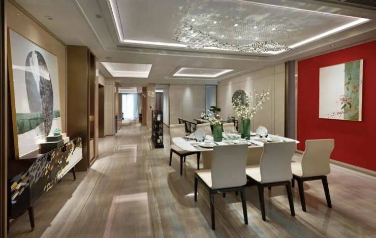 创意展示用房的餐厅与茶室融合一体,一起约40平的宽敞空间,在家中商务会谈也有专属领地。