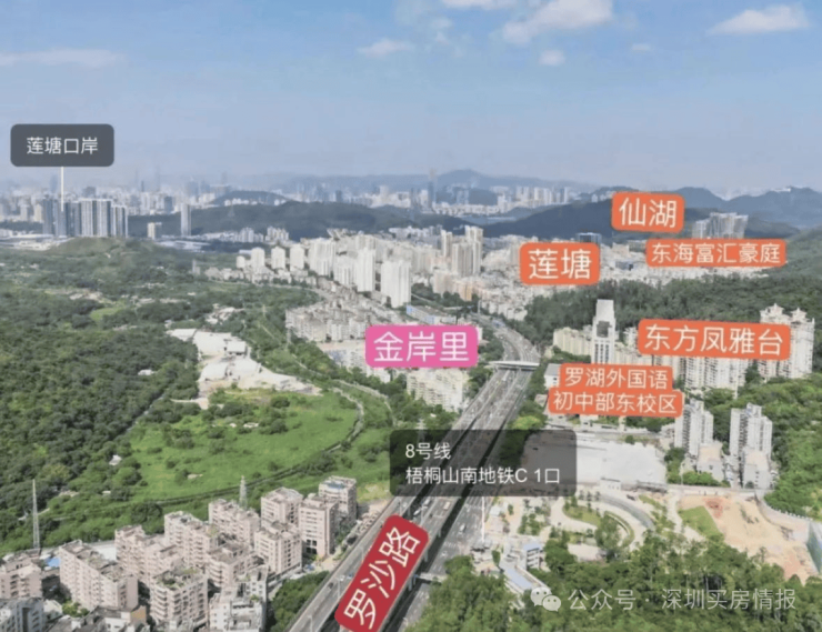 莲塘金岸里,位于罗湖区莲塘街道港莲路与莲南路交汇处,地处罗湖与盐田两区接壤处,北依梧桐山国家森林公园,南面与香港新界打鼓岭隔深圳河相望,距离不足200米,是深圳少有的"一线临港"住宅项目。