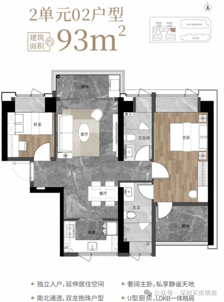 93㎡的3房2厅2卫,1栋2单元02户型,设计的是竖厅南北通透格局,独立入户,客厅3.6米开间,客餐厅分离设计,U型厨房,卫生间干湿分离,阳台正北朝向。