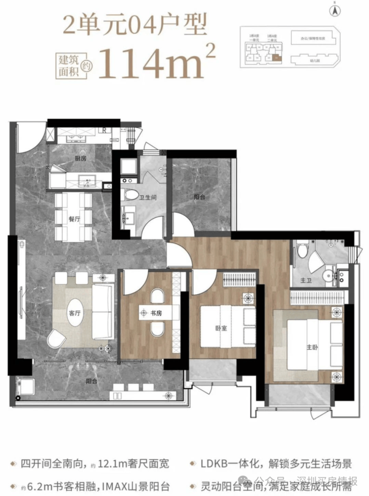 114㎡的4房2厅2卫,1栋2单元04户型,设计的是经典竖厅格局,客厅3.85米开间,LDKB一体化设计,动静分区,四开间朝南,12.1米面宽,二字型厨房,卫生间干湿分离,客厅连接次卧出6.2米长大观景大阳台,正南朝向。