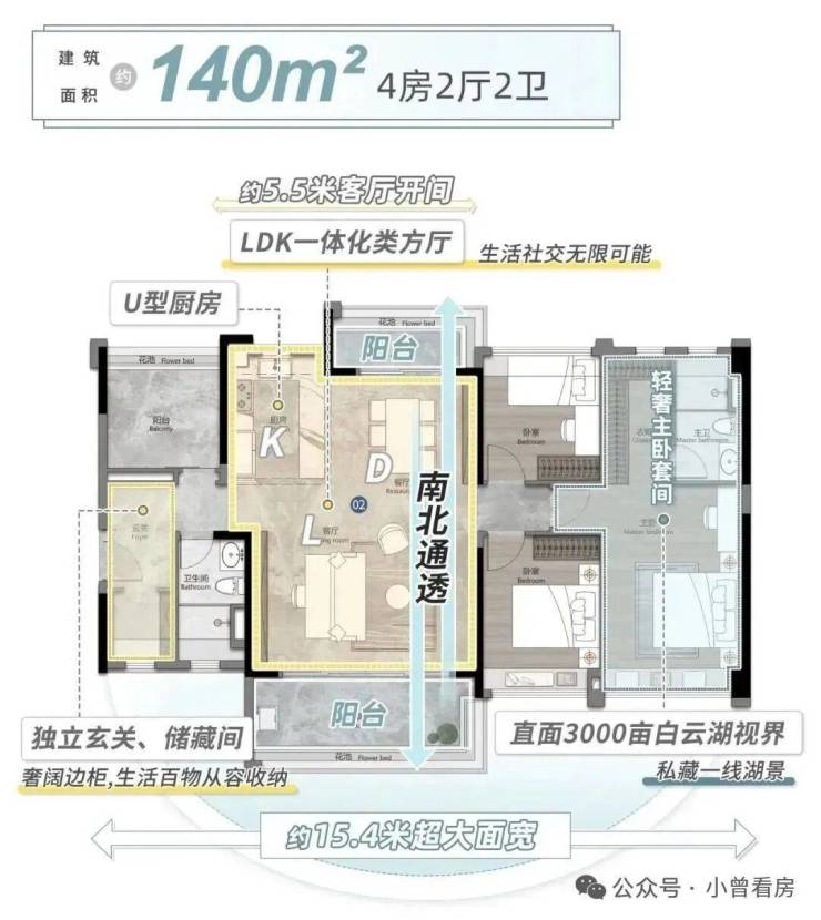 白云湖位于项目的东北角,首先,项目规划的楼栋全部采取一定角度的扭转38°,让湖景更好地分落到不同楼栋和不同户型上。同时,又采取北高南低的布局战略,确保东北面的湖景视野,同时又使得南北楼栋拥有多一小时的采光,通风也更加通畅。