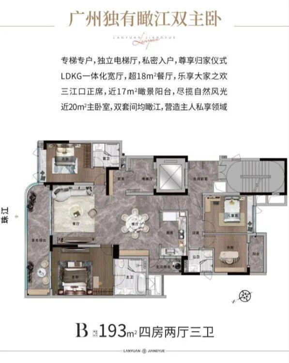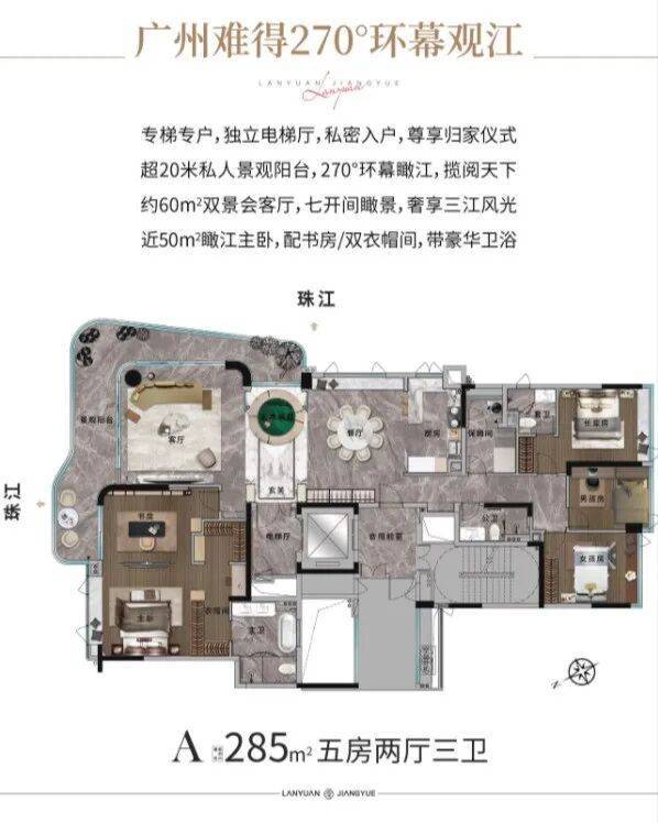 仅规划 193㎡、285㎡两种大平层户型,均为专梯入户设计,配备 L 型一线江景阳台,部分户型可享 270 度环幕江景,实用率与舒适度拉满。