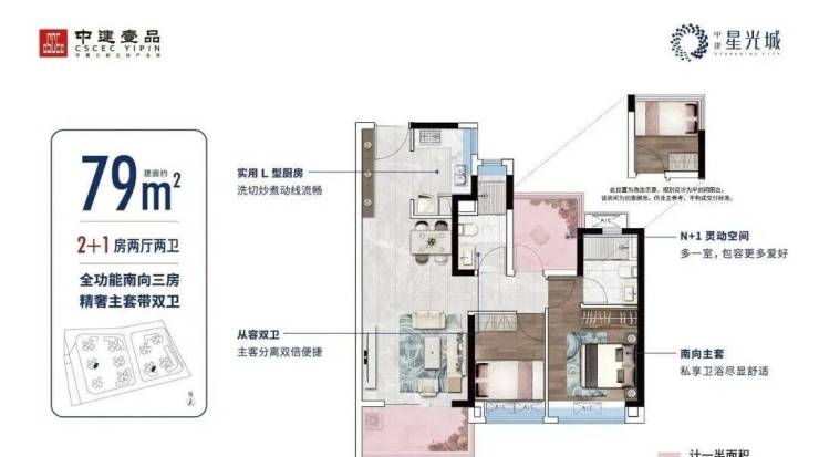 建面约79㎡丨主套双卫3房 东南向瞰园林