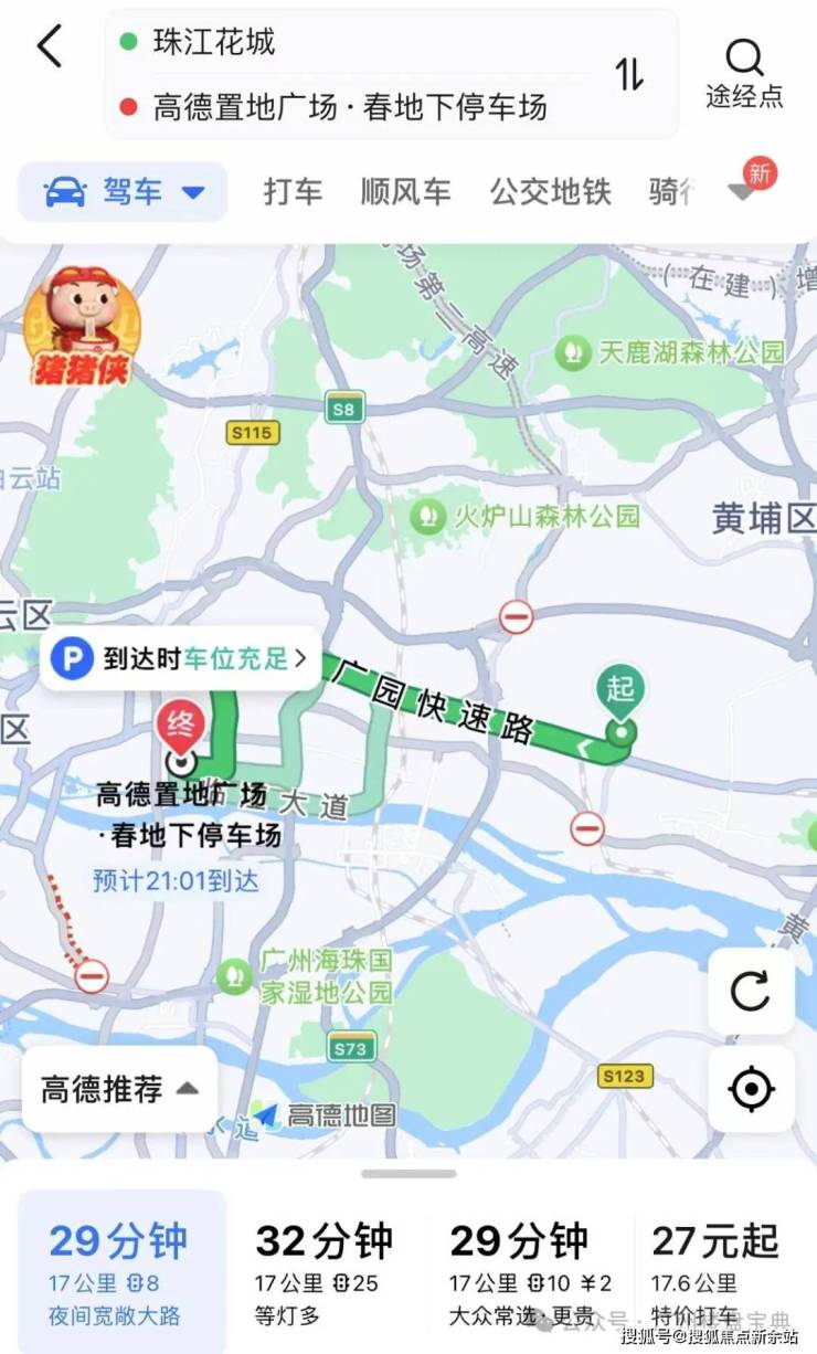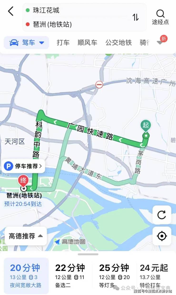 自驾或地铁通勤珠江新城:走广园快速路转天河东路即可到达珠江新城,全程17公里耗时28分钟,打车27块,公交+地铁15站耗时65分钟。