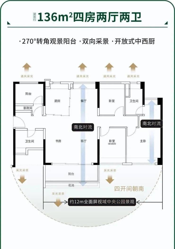 建面136平四房两卫,四开间朝南,12米南向采光面,南北对流户型,餐客厅+主卧也是南北对流