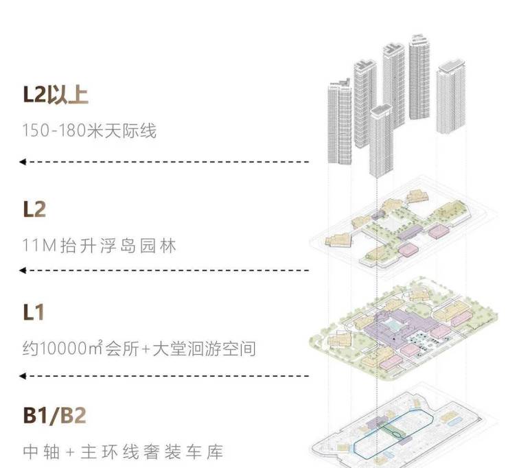 ● 城市首创新境:挑高11米空中浮岛,融合艺术商业街区,构建三重洄游动线(地面大堂、星空车库、浮岛花园),打造“立体都会客厅”。